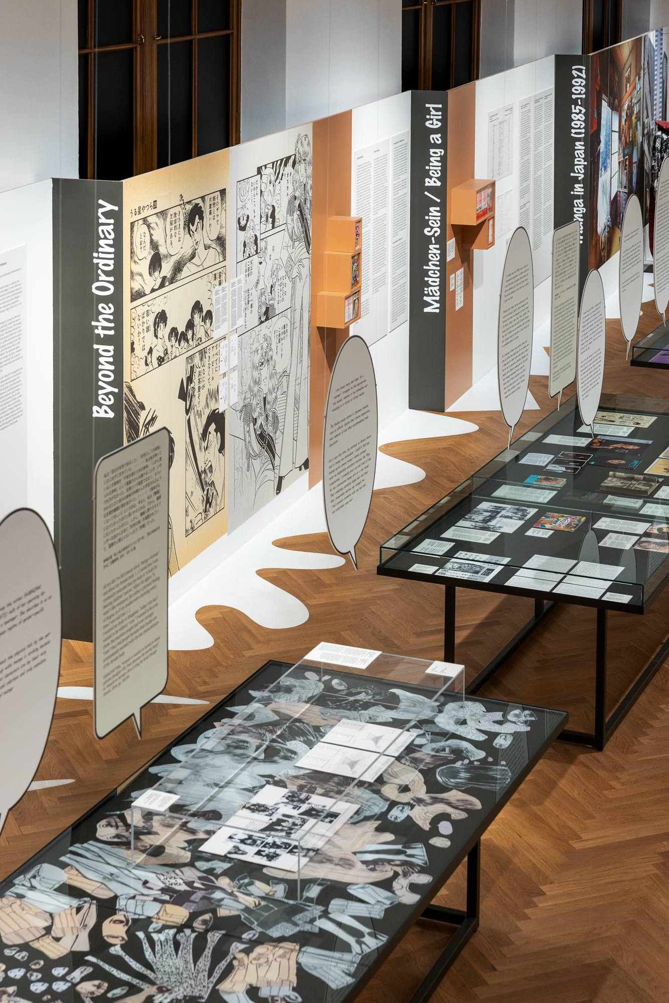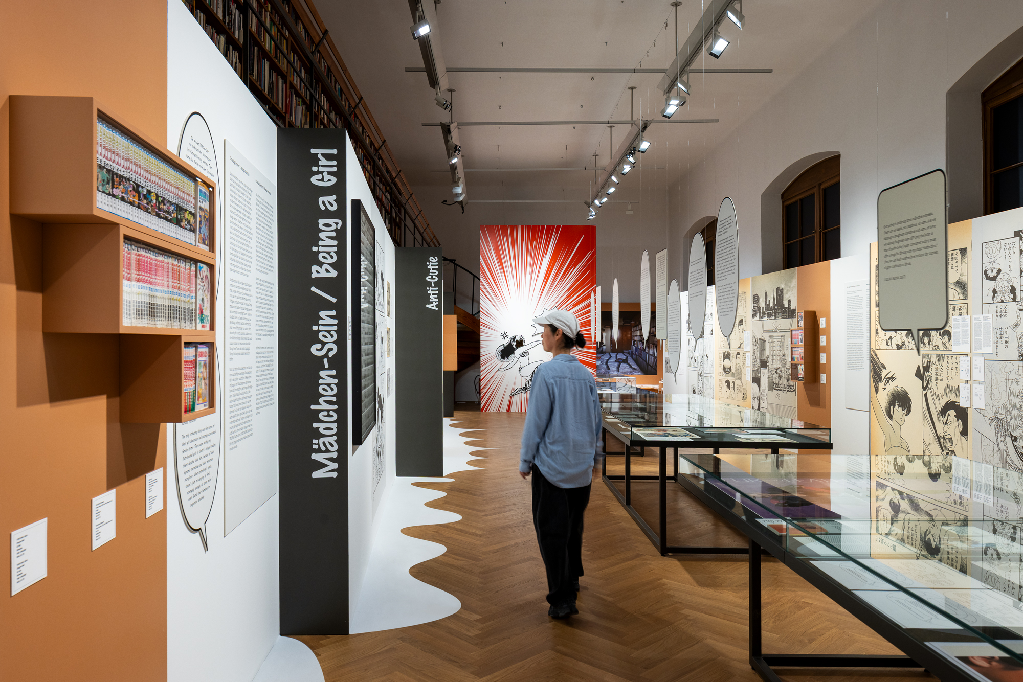 The different thematic areas of the exhibition are expressed through the zig-zagging rhythm of the display walls. While their end faces are reminiscent of book spines, the walls seem to bleed out onto the floor. The contours of these floor markings are inspired by ‘manpus’, the emotional symbols found in manga comics.
