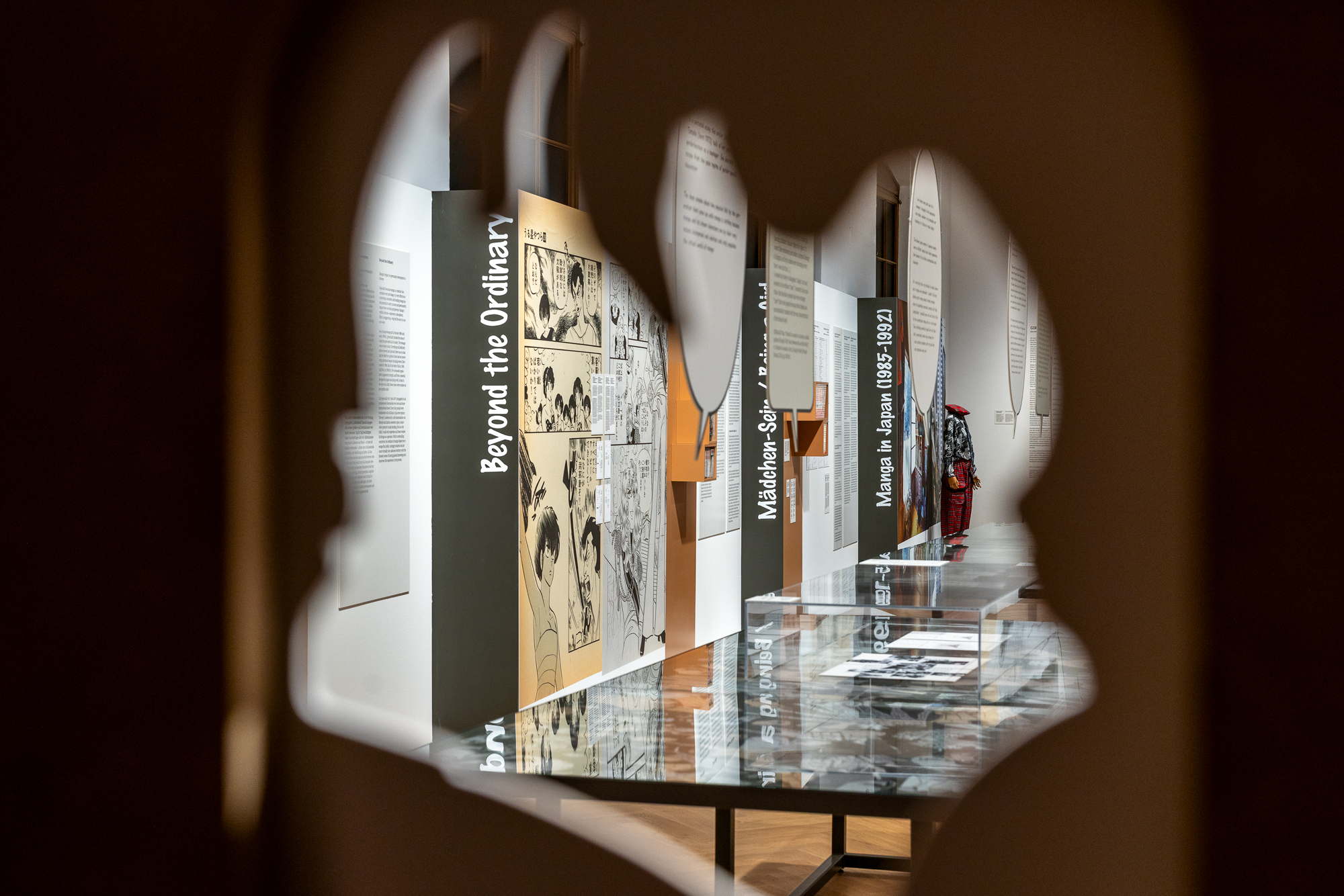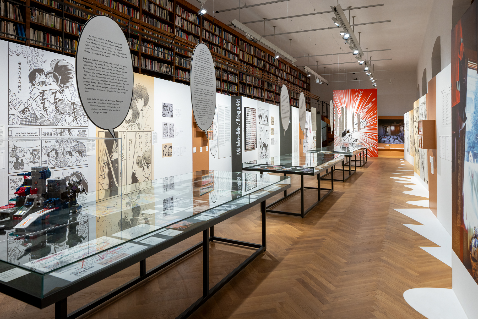 Oversized manga page reproductions invite you to dive into their many worlds. Custom-made manga boxes echo the theme of bookshelves in both children’s rooms and comic book shops.